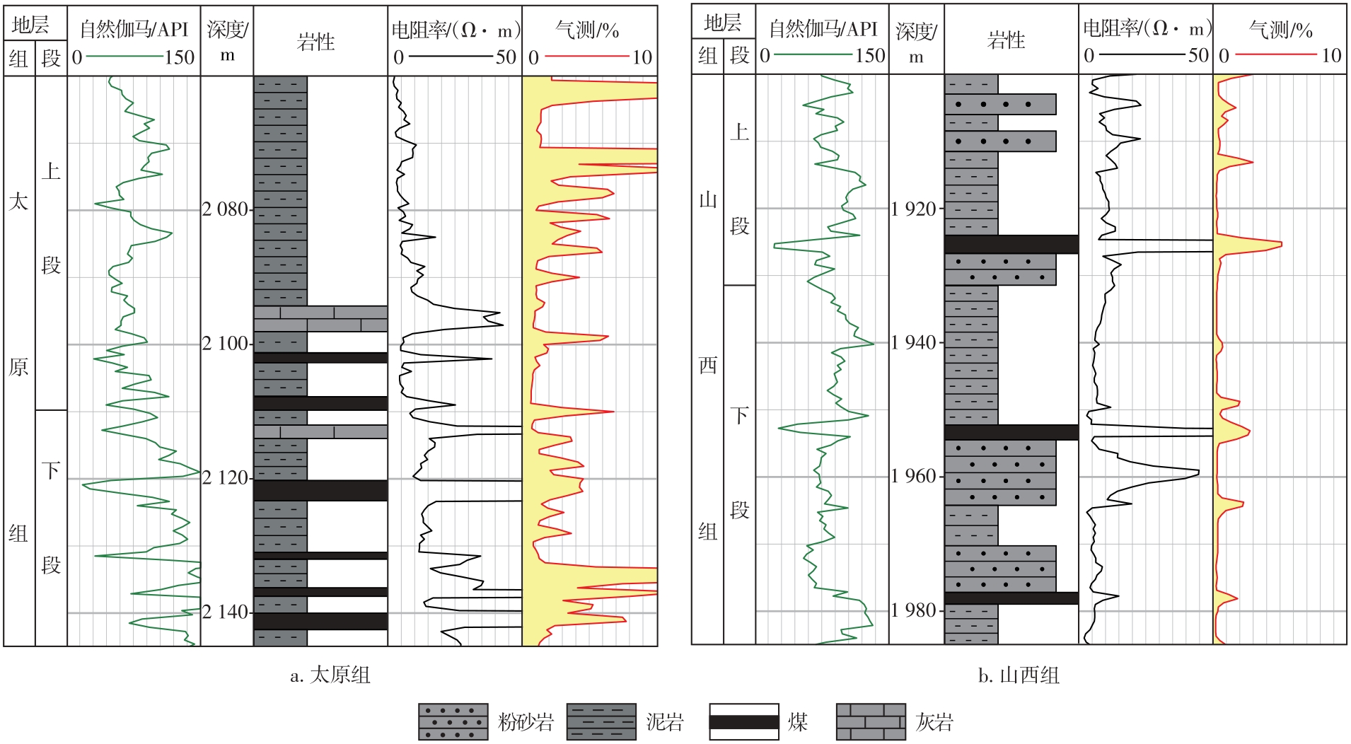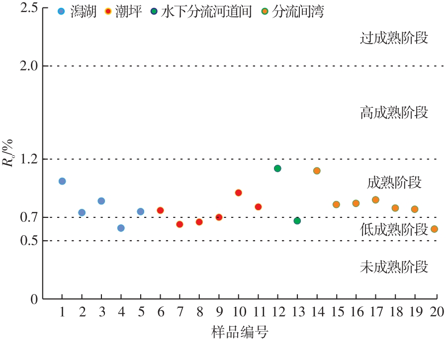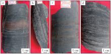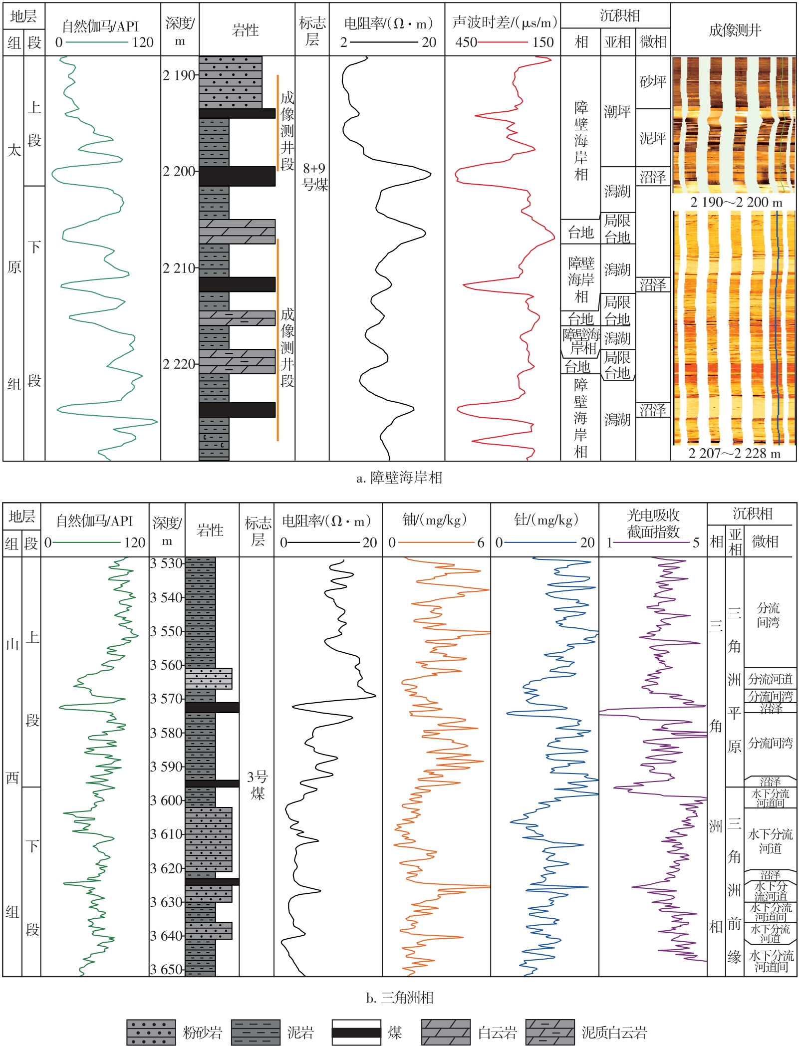 Shale is at the forefront of oil and gas geological research and a hotspot for exploration; however, research has mainly focused on marine and lacustrine shale systems, while studies on shale within transitional coal-measure strata are relatively limited. The Carboniferous-Permian coal-measure strata in the Bohai Bay Basin are well-developed, characterized by widely distributed, regionally stable, and thick shale layers. These strata represent excellent source rocks and reservoirs, indicating significant potential for oil and gas exploration and development. This study investigated the coal-measure shale of the Carboniferous-Permian Taiyuan and Shanxi Formations in the Huanghua Depression of the Bohai Bay Basin. Using data from core analysis, thin sections, well logging, organic carbon content, Rock-Eval pyrolysis, and vitrinite reflectance (R0), this study examined the depositional environment types of coal-measure shale, the vertical evolution of the depositional environments, and the organic geochemical properties of the shale from different depositional environments. This research aims to provide a theoretical basis for oil and gas exploration in the Carboniferous-Permian coal-measure strata of the Bohai Bay Basin. The Carboniferous-Permian coal-measure strata in the Huanghua Depression were divided into the Taiyuan Formation and the Shanxi Formation. The Taiyuan Formation was mainly characterized by barrier coastal facies, while the Shanxi Formation was dominated by deltaic facies. The shale of the Taiyuan Formation was primarily deposited in lagoon and tidal flat environments of the barrier coastal system, whereas the shale of the Shanxi Formation was mainly deposited in subaqueous distributary channels and interdistributary bay environments of the deltaic system. The lithological and logging characteristics of shale from different sedimentary facies were identified. Lagoon shale was gray-black, with well-developed horizontal laminations. Under the microscope, felsic material was visible, with fine particle sizes generally at the silt grade. Brownish-red siderite concretions were common, often exhibiting irregular ellipsoidal shapes with their long axes typically aligned parallel to the bedding planes. Lagoon shale exhibited distinct logging responses, characterized by high natural gamma and high resistivity on conventional logs, and bright yellow to bright red backgrounds with faint lamination structures on image logs. Tidal flat shale was mainly deposited in tidal flat environments. It was predominantly gray to black or dark gray. In core samples, well-developed felsic bands with a thickness of approximately 1 mm were visible. These felsic bands were laterally discontinuous and tapered off within the core samples. The particles within the bands were fine-grained, mainly silt-sized. Compared to lagoon shale, the tidal flat shale exhibited significantly lower resistivity. In imaging logs, the color appeared noticeably darker. The low response was attributed to the development of felsic bands within the tidal flat shale. The interbedding of thin sand and mud layers resulted in individual shale layers that were thinner than the vertical resolution of resistivity logging tools, leading to the measured apparent resistivity values being lower than the true formation resistivity. Consequently, the resistivity of tidal flat shale in the study area was significantly lower than that of the lagoon shale. Shale in subaqueous distributary channels was dark gray to gray-black and contained abundant siderite concretions occurring in banded and irregularly massive forms. These concretions mainly consisted of microcrystalline siderite grains, with minor felsic detrital particles, and were commonly associated with carbonaceous debris. Carbon and oxygen isotope analyses indicated that the formation of siderite in the delta front was influenced by organic matter and the water chemistry of the depositional environment. After deposition in the delta front, terrestrial carbonaceous debris decomposed, releasing CO32-, which combined with Fe2+ in the pore water to form siderite. The water coverage in the delta front also provided favorable conditions for siderite development. The abundant siderite in the shale reduced the formation conductivity and radioactive element content, resulting in low resistivity, uranium, and thorium readings on logs. Conversely, the high photoelectric absorption cross-section (Pe) of siderite increased the Pe value of the formation. Shale in interdistributary bays exhibited diverse colors, including dark gray, gray, and variegated colors, indicating strong water-level fluctuations during deposition and the presence of both subaqueous and emergent environments. Siderite was less developed in the interdistributary bay shale. Consequently, its resistivity and radioactive element content were significantly higher, and its Pe value was significantly lower than those of the subaqueous distributary channel shale. The depositional evolution of the Taiyuan and Shanxi Formations recorded a transition from the peak of the Late Paleozoic marine transgression to subsequent regression. Consequently, the depositional environments of shale transitioned from barrier coastal to deltaic facies, with shale sequentially developing in lagoon, tidal flat, delta front, and delta plain subfacies from bottom to top. The measured total organic carbon content of the shale varied among depositional environments: lagoon shale (0.11%~19.30%, avg. 3.81%), tidal flat shale (0.70%~17.99%, avg. 4.18%), subaqueous distributary channel shale (0.29%~5.91%, avg. 2.45%), and interdistributary bay shale (0.03%~7.36%, avg. 2.21%). A comparison showed that the tidal flat shale had the highest average total organic carbon abundance, followed by lagoon shale, subaqueous distributary channel shale, and interdistributary bay shale. Overall, the organic matter abundance of shale from barrier coastal facies was higher than th