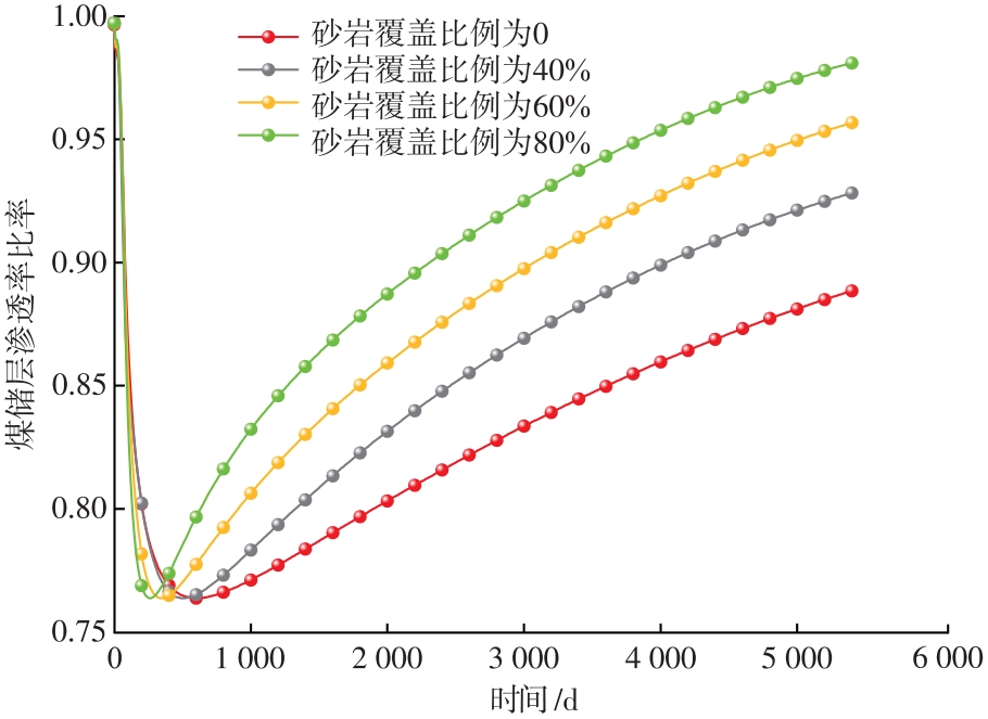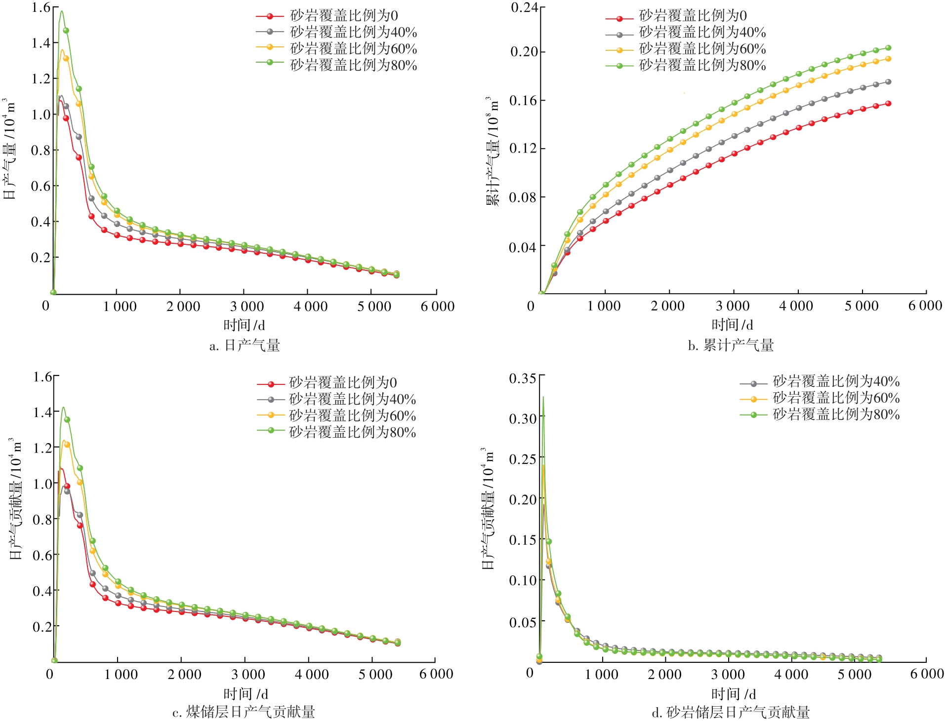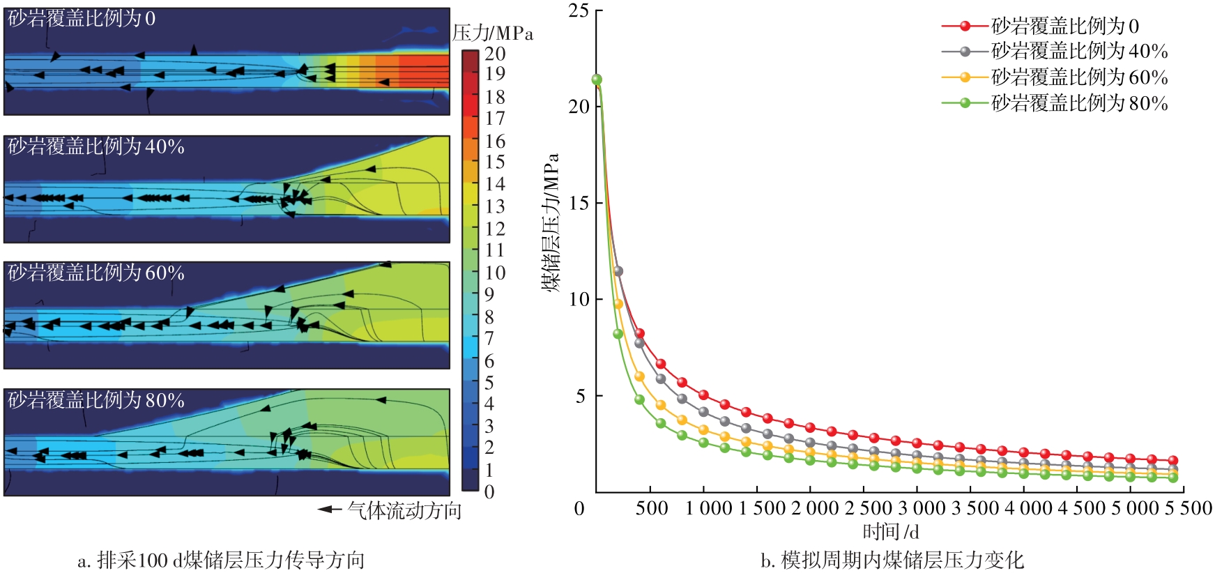 In the Shenfu block located on the eastern margin of the Ordos Basin, the deep coal seam is intimately interlayered with the tight sandstone layer. During the development of deep coalbed methane, a notable phenomenon has been observed whereby tight sandstone gas from the roof migrates into the coal seam. To date, studies on the impact of roof tight sandstone gas migration on deep coalbed methane production remain scarce. Taking the No.8+9 coal seam and its roof and floor in the Shenfu block as the study object, a numerical simulation of vertical well drainage was conducted for deep coalbed methane under different sandstone coverage ratios (i.e., the proportion of roof sandstone covering the coal seam within the well control range). This study investigated the roles of reservoir pressure conduction, gas desorption/diffusion, and dynamic changes in permeability in governing the influence of roof tight sandstone gas migration on the gas production performance of deep coalbed methane wells and explored its underlying mechanism. The results show that during the development of deep coalbed methane, the migration of roof-tight sandstone gas into the coal seam contributes to the gas output of deep coalbed methane wells. With the increase of roof sandstone coverage, the contribution of tight sandstone gas to cumulative gas production correspondingly increases by 11.43%, 23.54%, and 29.35% at sandstone coverage ratios of 40%, 60%, and 80%, respectively, In comparison to cases with a mudstone roof. Outside the control range of hydraulic fracturing, gas and water production from the sandstone layer occurs more rapidly. This enlarges both the magnitude and spatial extent of the pressure drop within the sandstone layer. As a result, pressure relief is indirectly facilitated in the coal seam, enhancing the rates of gas desorption and diffusion. Additionally, it strengthens the shrinkage effect of the coal matrix and promotes the recovery of permeability ratio. The improvement in permeability further augments the reservoir pressure conduction and gas desorption/diffusion, thereby improving the gas production performance of coalbed methane wells.