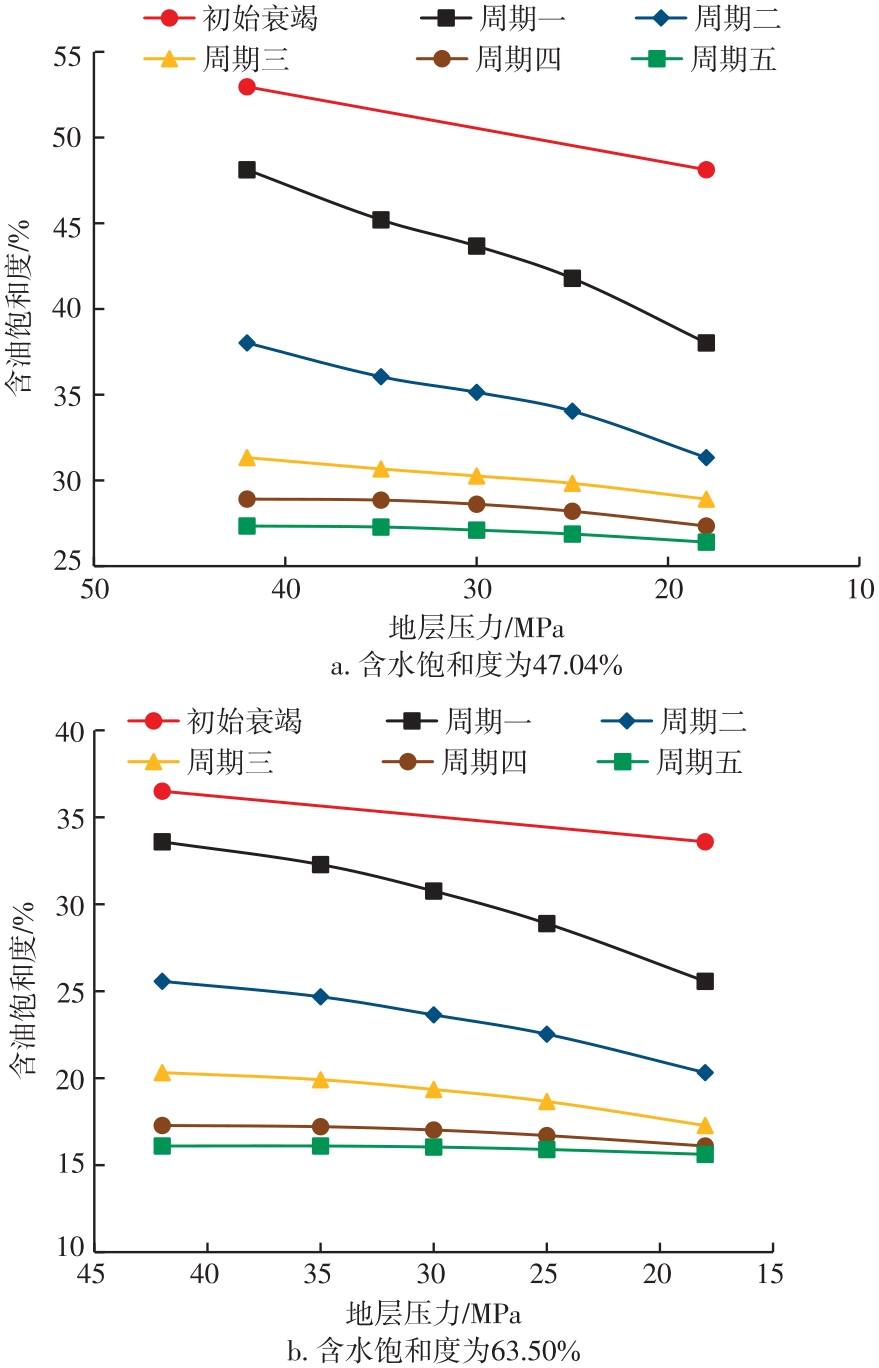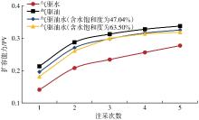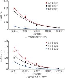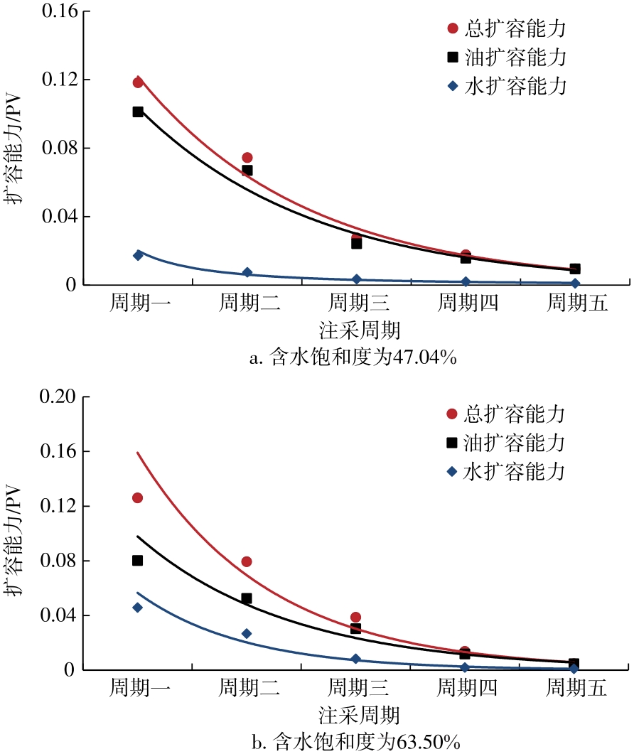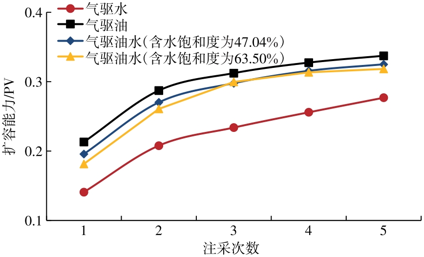 Reservoir-converted gas storage has emerged as a new development approach worldwide in recent years. Many oil-bearing structures in China meet the conditions for conversion into gas storage, offering broad application prospects for improving oil recovery rates, diversifying gas storage types, and meeting regional gas supply demands. Using a full-diameter core from the Banshen 37 fault block in the Dagang Oilfield and based on the injection-production patterns of reservoir-converted gas storage, a multi-cycle displacement alternating experiment was designed to analyze the seepage mechanisms of converted gas storage in sandstone oil reservoirs and establish a single-well productivity prediction model. The experimental results demonstrate that: (1) Gas exhibits both displacement and extraction effects on water and oil, positively contributing to the enhancement of gas storage capacity. (2) In multi-cycle displacement alternating experiments of gas-water and gas-oil displacement (simulating the late-stage development of water-bearing layers or water-driven oil reservoirs and the early-stage development of converted gas storage in oil reservoirs, respectively), the storage capacity expansion follows a power-law relationship with the number of injection-production cycles, ultimately reaching 27.73% and 33.74%, respectively. Moreover, appropriately lowering the minimum operating pressure of the gas storage can enhance storage capacity. (3) In multi-cycle gas-oil-water displacement alternating experiments (simulating the actual development of converted gas storage in oil reservoirs), under oil-water coexistence conditions, higher water saturation weakens the expansion capacity of the gas storage (with initial water saturation of the core in the two experiments at 47.04% and 63.50%, respectively, leading to expansion capacities of 32.51% and 31.85% , respectively); ④ Based on relative permeability curve tests, a rapid prediction method different from numerical simulation was proposed for single-well productivity of converted gas storage in oil reservoirs. Productivity equations and absolute open flow under different injection-production cycles were established. The findings provide essential guidance for early-stage storage capacity analysis and productivity design of converted gas storage in oil reservoirs.