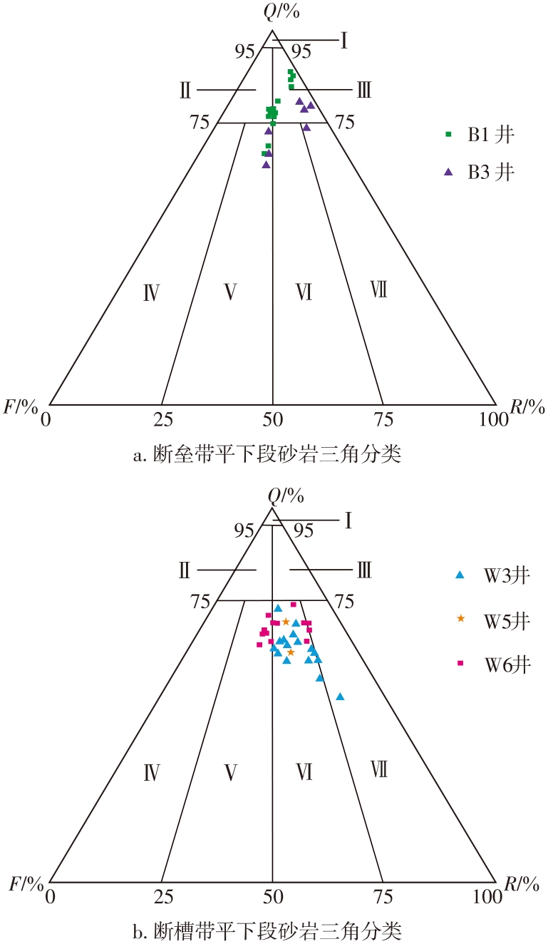 | Fig.4 Ternary classification diagrams of sandstones from lower Pinghu member in well block W, Xihu Sag |
